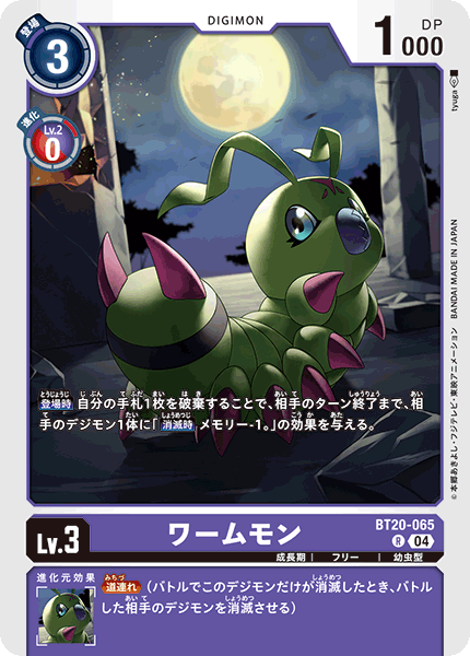 Lv.3 ワームモン BT20-065 R 成長期 | フリー | 幼虫型 【登場時】自分の手札1枚を破棄することで、相手のターン終了まで、相手のデジモン1体に「【消滅時】メモリー-1。」の効果を与える。 --- ≪道連れ≫(バトルでこのデジモンだけが消滅したとき、バトルした相手のデジモンを消滅させる)