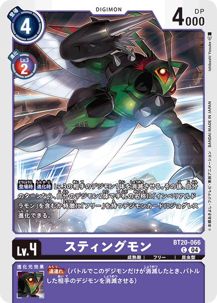 Lv.4 スティングモン BT20-066 C 成熟期 | フリー | 昆虫型 【登場時】【進化時】Lv.3の相手のデジモン1体を消滅させる。その後、自分のターンなら、自分のデジモン2体で手札の名称に「インペリアルドラモン」を含むか特徴に「フリー」を持つデジモンカードにジョグレス進化できる。 --- ≪道連れ≫(バトルでこのデジモンだけが消滅したとき、バトルした相手のデジモンを消滅させる)