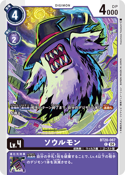 Lv.4 ソウルモン BT20-067 C 成熟期 | ウィルス種 | ゴースト型 【登場時】【進化時】相手のターン終了まで、自分のデジモン1体は≪道連れ≫を得る。 --- 【消滅時】自分の手札1枚を破棄することで、Lv.4以下の相手のデジモン1体を消滅させる。