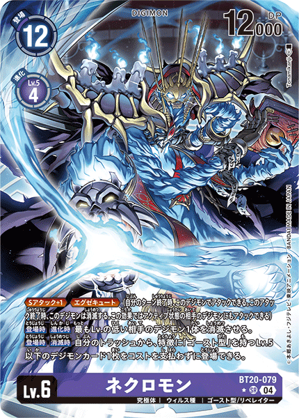 Lv.6 ネクロモン BT20-079 SR 究極体 | ウィルス種 | ゴースト型/リベレイター ≪Sアタック+1≫≪エグゼキュート≫(自分のターン終了時、このデジモンでアタックできる。このアタック終了時、このデジモンは消滅する。この効果ではアクティブ状態の相手のデジモンにもアタックできる) 【登場時】【進化時】最もLv.の低い相手のデジモン1体を消滅させる。 【登場時】【消滅時】自分のトラッシュから、特徴に「ゴースト型」を持つLv.5以下のデジモンカード1枚をコストを支払わずに登場できる。 ---