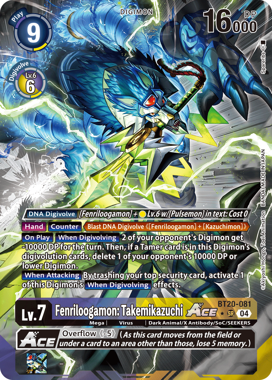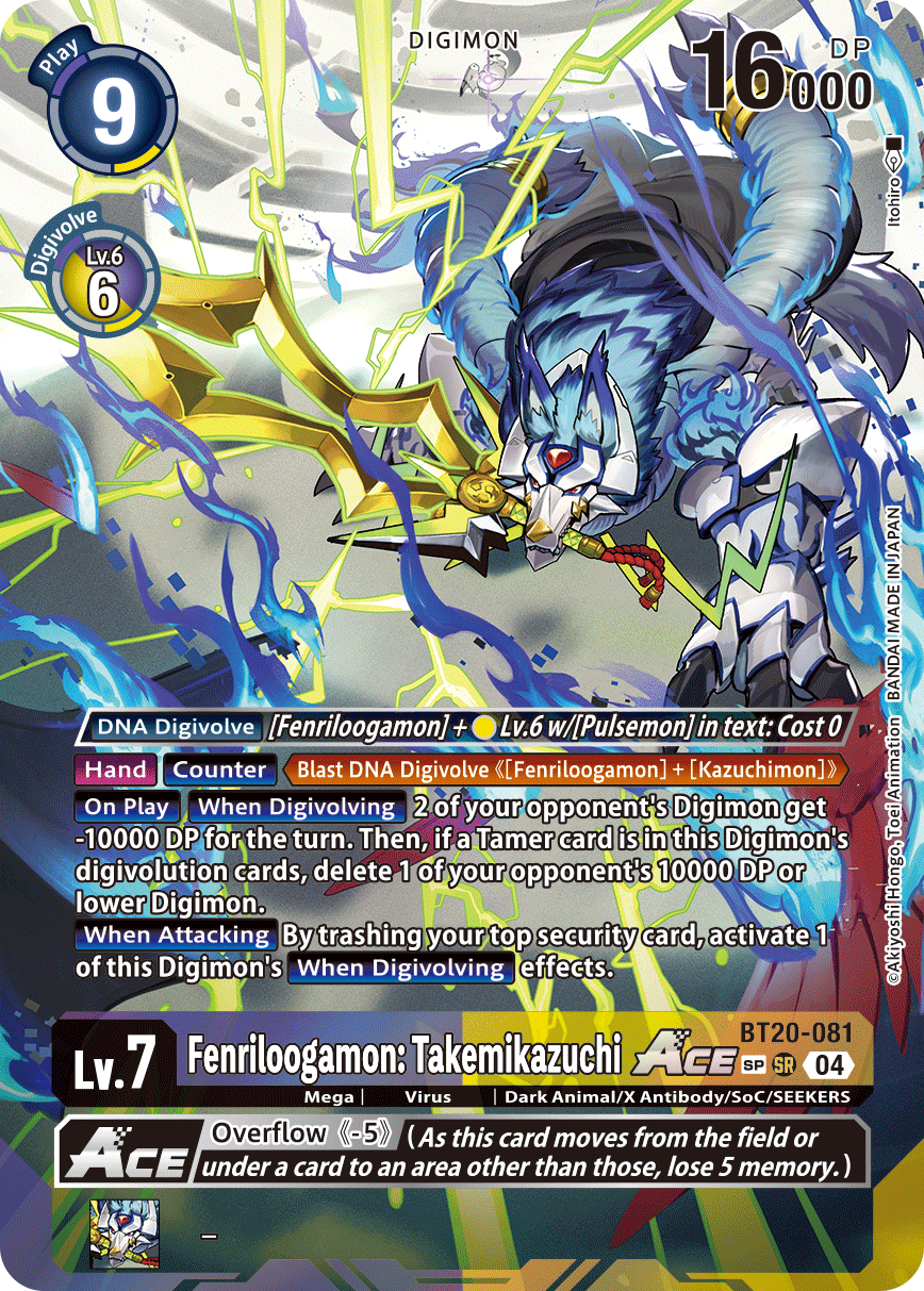 Lv.7 Fenriloogamon: Takemikazuchi ACE BT20-081 SR Mega | Virus | Dark Animal/X Antibody/SoC/SEEKERS [DNA Digivolve] [Fenriloogamon] + yellow Lv.6 w/[Pulsemon] in text: Cost 0 [Hand] [Counter] <Blast DNA Digivolve ([Fenriloogamon] + [Kazuchimon])>. [On Play] [When Digivolving] 2 of your opponent's Digimon get -10000 DP for the turn. Then, if a Tamer card is in this Digimon's digivolution cards, delete 1 of your opponent's 10000 DP or lower Digimon. [When Attacking] By trashing your top security card, activate 1 of this Digimon's [When Digivolving] effects. --- <Overflow (-5)> (As this card moves from the field or under a card to an area other than those, lose 5 memory.)