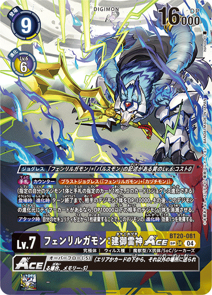 Lv.7 フェンリルガモン:建御雷神ACE BT20-081 SR 究極体 | ウィルス種 | 魔獣型/X抗体/SoC/シーカーズ [手札]【カウンター】≪ブラストジョグレス《「フェンリルガモン」+「カヅチモン」》≫(指定の自分のデジモン1体と手札の指定のカード1枚で、このカードにジョグレス進化できる) 【登場時】【進化時】ターン終了まで、相手のデジモン2体をDP-10000。その後、このデジモンの進化元にテイマーカードがあるなら、DP10000以下の相手のデジモン1体を消滅させる。 【アタック時】自分のセキュリティを上から1枚破棄することで、このデジモンの【進化時】効果1つを発揮する。 ---