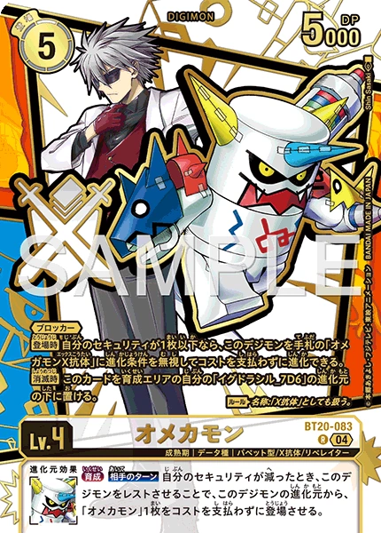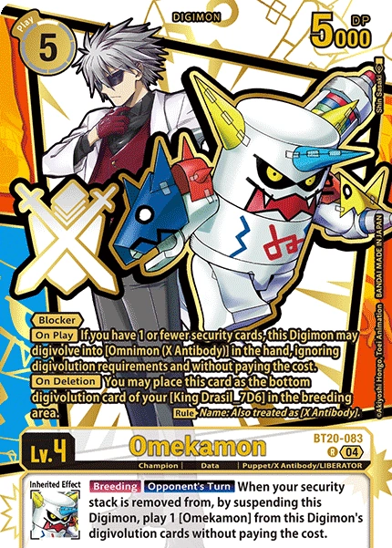 Lv.4 Omekamon BT20-083 R champion | Data | Puppet/X Antibody/LIBERATOR <Blocker> [On Play] If you have 1 or fewer security cards, this Digimon may digivolve into [Omnimon (X Antibody)] in the hand, ignoring digivolution requirements and without paying the cost. [On Deletion] You may place this card as the bottom digivolution card of your [King Drasil_7D6] in the breeding area. (Rule) Name: Also treated as [X Antibody]. --- [Breeding] [Opponent's Turn] When your security stack is removed from, by suspending this Digimon, play 1 [Omekamon] from this Digimon's digivolution cards without paying the cost.