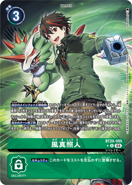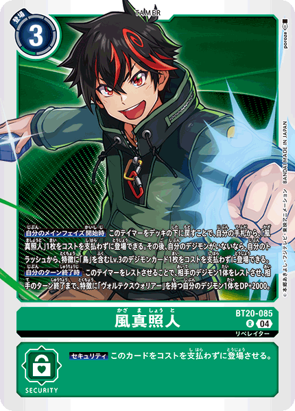 風真照人 BT20-085 R リベレイター 【自分のメインフェイズ開始時】このテイマーをデッキの下に戻すことで、自分の手札から、「風真照人」1枚をコストを支払わずに登場できる。その後、自分のデジモンがいないなら、自分のトラッシュから、特徴に「鳥」を含むLv.3のデジモンカード1枚をコストを支払わずに登場できる。 【自分のターン終了時】このテイマーをレストさせることで、相手のデジモン1体をレストさせ、相手のターン終了まで、特徴に「ヴォルテクスウォリアー」を持つ自分のデジモン1体をDP+2000。 --- 【セキュリティ】このカードをコストを支払わずに登場させる。