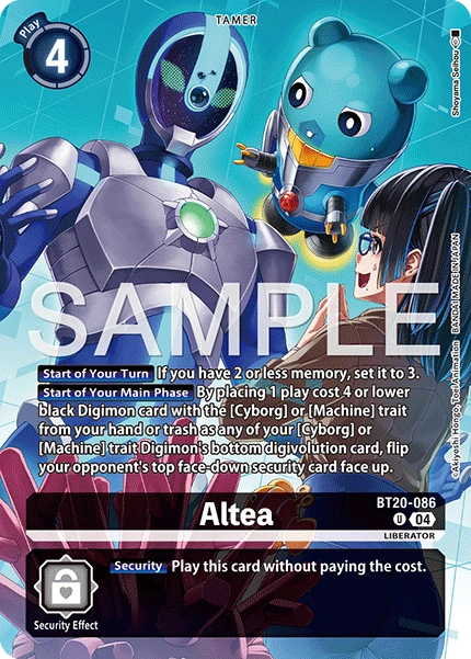 Altea BT20-086 U LIBERATOR [Start of Your Turn] If you have 2 or less memory, set it to 3. [Start of Your Main Phase] By placing 1 play cost 4 or lower black Digimon card with the [Cyborg] or [Machine] trait from your hand or trash as any of your [Cyborg] or [Machine] trait Digimon's bottom digivolution card, flip your opponent's top face-down security card face up. --- [Security] Play this card without paying the cost.
