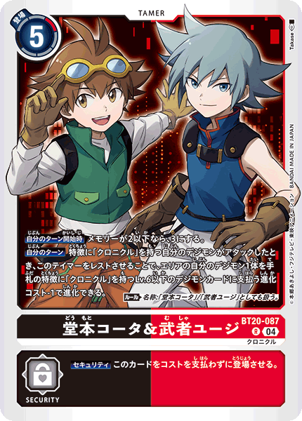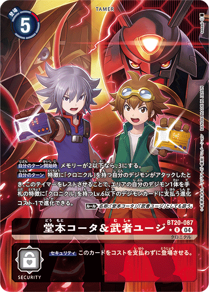 堂本コータ&武者ユージ BT20-087 R クロニクル 【自分のターン開始時】メモリーが2以下なら、3にする。 【自分のターン】特徴に「クロニクル」を持つ自分のデジモンがアタックしたとき、このテイマーをレストさせることで、エリアの自分のデジモン1体を手札の特徴に「クロニクル」を持つLv.6以下のデジモンカードに支払う進化コスト-1で進化できる。 〈ルール〉名称:「堂本コータ」/「武者ユージ」としても扱う。 --- 【セキュリティ】このカードをコストを支払わずに登場させる。