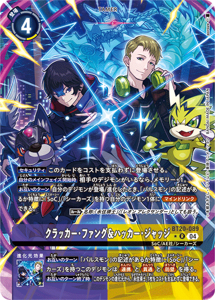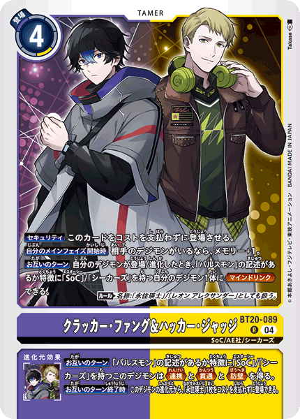 クラッカー• ファング&ハッカー• ジャッジ BT20-089 R SoC/AE社/シーカーズ 【セキュリティ】このカードをコストを支払わずに登場させる。 【自分のメインフェイズ開始時】相手のデジモンがいるなら、メモリー+1。 【お互いのターン】自分のデジモンが登場/進化したとき、「パルスモン」の記述があるか特徴に「SoC」/「シーカーズ」を持つ自分のデジモン1体に≪マインドリンク≫できる。 〈ルール〉名称:「永住瑛士」/「レオン アレクサンダー」としても扱う。 --- 【お互いのターン】「パルスモン」の記述があるか特徴に「SoC」/「シーカーズ」を持つこのデジモンは≪連携≫と≪貫通≫と≪防壁≫を得る。 【お互いのターン終了時】このデジモンの進化元から、「永住瑛士」1枚をコストを支払わずに登場できる。