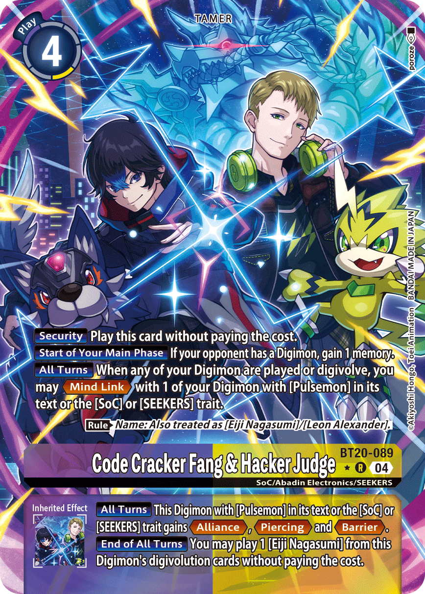 Code Cracker Fang & Hacker Judge BT20-089 R SoC/Abadin Electronics/SEEKERS [Security] Play this card without paying the cost. [Security] Play this card without paying the cost. [Start of Your Main Phase] If your opponent has a Digimon, gain 1 memory. [All Turns] When any of your Digimon are played or digivolve, you may <Mind Link> to 1 of your Digimon [Pulsemon] in its text or the [SoC] or [SEEKERS] trait. (Rule) Name: Also treated as [Eiji Nagasumi]/[Leon Alexander]. --- [All Turns] This Digimon with [Pulsemon] in its text or the [SoC] or [SEEKERS] trait gains <Alliance>, <Piercing> and <Barrier>. [End of All Turns] You may play 1 [Eiji Nagasumi] from this Digimon's digivolution cards without paying the cost.