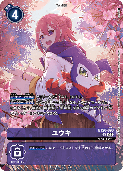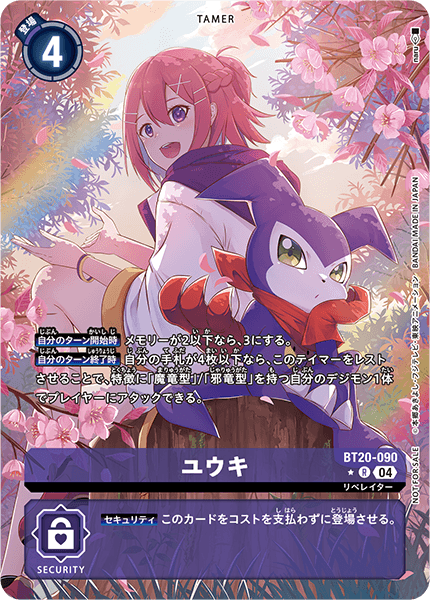 ユウキ BT20-090 R リベレイター 【自分のターン開始時】メモリーが2以下なら、3にする。 【自分のターン終了時】自分の手札が4枚以下なら、このテイマーをレストさせることで、特徴に「魔竜型」/「邪竜型」を持つ自分のデジモン1体でプレイヤーにアタックできる。 --- 【セキュリティ】このカードをコストを支払わずに登場させる。