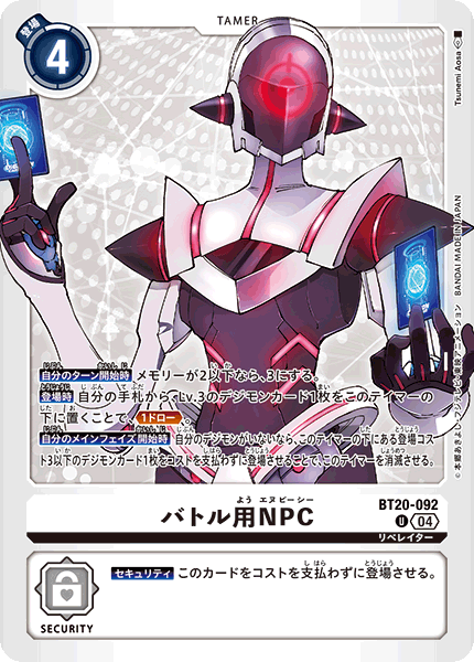 バトル用NPC BT20-092 U リベレイター 【自分のターン開始時】メモリーが2以下なら、3にする。 【登場時】自分の手札から、Lv.3のデジモンカード1枚をこのテイマーの下に置くことで、≪1ドロー≫。 【自分のメインフェイズ開始時】自分のデジモンがいないなら、このテイマーの下にある登場コスト3以下のデジモンカード1枚をコストを支払わずに登場させることで、このテイマーを消滅させる。 --- 【セキュリティ】このカードをコストを支払わずに登場させる。