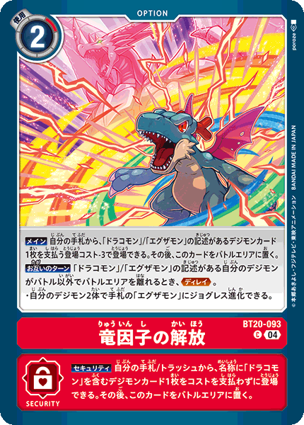 竜因子の解放 BT20-093 C 【メイン】自分の手札から、「ドラコモン」/「エグザモン」の記述があるデジモンカード1枚を支払う登場コスト-3で登場できる。その後、このカードをバトルエリアに置く。 【お互いのターン】「ドラコモン」/「エグザモン」の記述がある自分のデジモンがバトル以外でバトルエリアを離れるとき、≪ディレイ≫。 • 自分のデジモン2体で手札の「エグザモン」にジョグレス進化できる。 --- 【セキュリティ】自分の手札/トラッシュから、名称に「ドラコモン」を含むデジモンカード1枚をコストを支払わずに登場できる。その後、このカードをバトルエリアに置く。