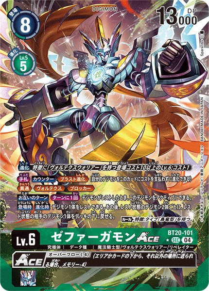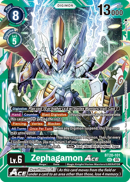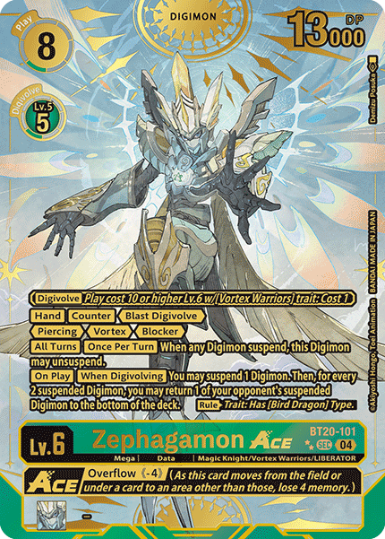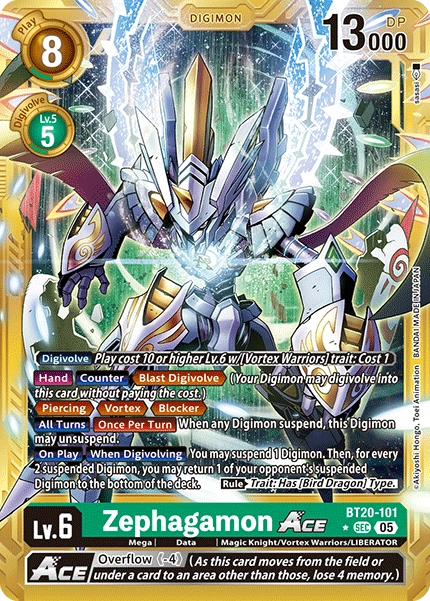 Lv.6 Zephagamon ACE BT20-101 SEC mega | Data | Magic Knight/Vortex Warriors/LIBERATOR [Digivolve] Play cost 10 or higher Lv.6 w/[Vortex Warriors] trait: Cost 1 [Hand] [Counter] <Blast Digivolve> (One of your Digimon may digivolve into this card without paying the cost.) <Piercing> (When this Digimon attacks and deletes an opponent's Digimon, it performs any security checks it normally would.) <Vortex> <Blocker> [All Turns] [Once Per Turn] When any Digimon suspend, this Digimon may unsuspend. [On Play] [When Digivolving] You may suspend 1 Digimon. Then, for every 2 suspended Digimon, you may return 1 of your opponent's suspended Digimon to the bottom of the deck. (Rule) Trait: Has [Bird Dragon] Type. --- <Overflow (-4)> (As this card moves from the battle area or under a card to another area, lose 4 memory.)