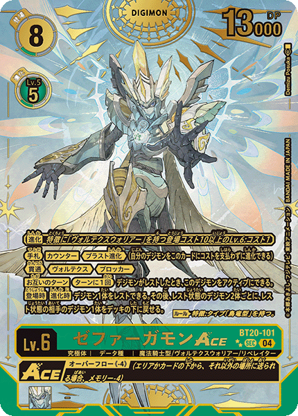 Lv.6 ゼファーガモンACE BT20-101 SEC 究極体 | データ種 | 魔法騎士型/ヴォルテクスウォリアー/リベレイター [手札]【カウンター】≪ブラスト進化≫(自分のデジモンをこのカードにコストを支払わずに進化できる) ≪貫通≫≪ヴォルテクス≫≪ブロッカー≫ 【お互いのターン】[ターンに1回]デジモンがレストしたとき、このデジモンをアクティブにできる。 【登場時】【進化時】デジモン1体をレストできる。その後、レスト状態のデジモン2体ごとに、レスト状態の相手のデジモン1体をデッキの下に戻せる。 〈ルール〉特徴:タイプ「鳥竜型」を持つ。 ---