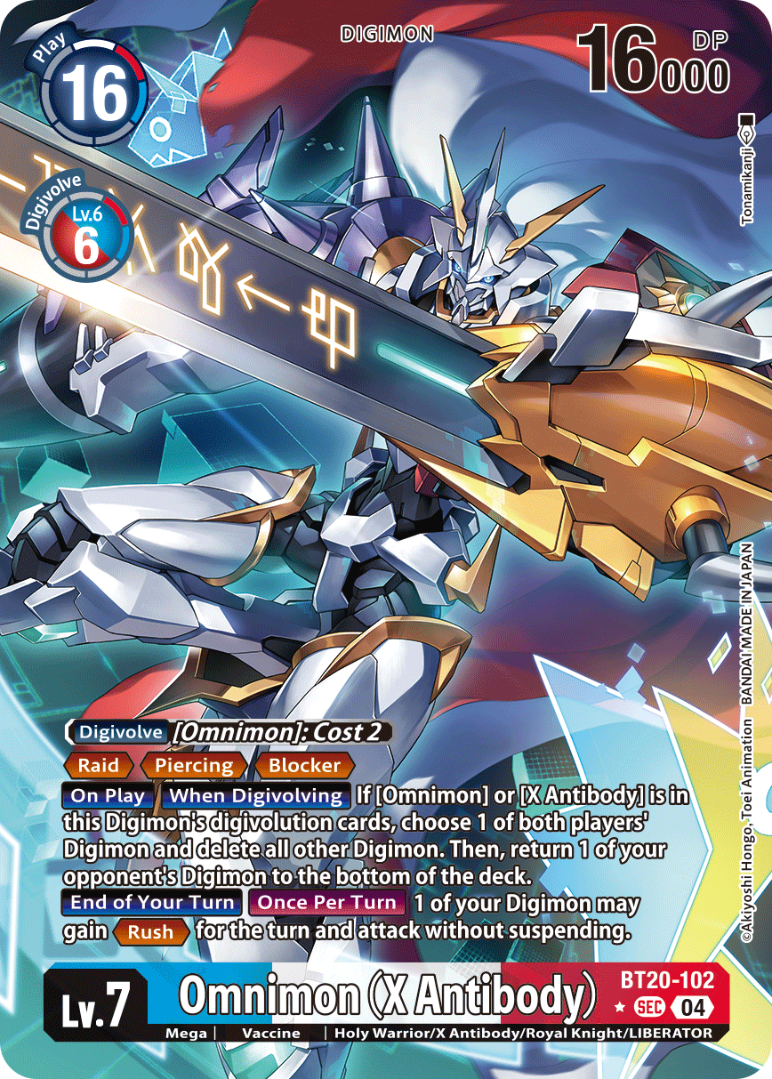 Lv.7 Omnimon (X Antibody) BT20-102 SEC mega | Vaccine | Holy Warrior/X Antibody/Royal Knight/LIBERATOR [Digivolve] [Omnimon]: Cost 2 <Raid> <Piercing> (When this Digimon attacks and deletes an opponent's Digimon, it performs any security checks it normally would.) <Blocker> [On Play] [When Digivolving] If [Omnimon] or [X Antibody] is in this Digimon's digivolution cards, choose 1 of both players' Digimon and delete all other Digimon. Then, return 1 of your opponent's Digimon to the bottom of the deck. [End of Your Turn] [Once Per Turn] 1 of your Digimon may gain <Rush> for the turn and attack without suspending.