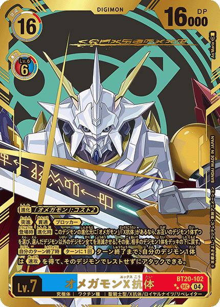 Lv.7 オメガモンX抗体 BT20-102 SEC 究極体 | ワクチン種 | 聖騎士型/X抗体/ロイヤルナイツ/リベレイター ≪突進≫≪貫通≫≪ブロッカー≫ 【登場時】【進化時】このデジモンの進化元に「オメガモン」/「X抗体」があるなら、お互いのデジモン1体ずつを選び、選んだデジモン以外のデジモン全てを消滅させる。その後、相手のデジモン1体をデッキの下に戻す。 【自分のターン終了時】[ターンに1回]ターン終了まで、自分のデジモン1体は≪速攻≫を得て、そのデジモンでレストせずにアタックできる。 ---