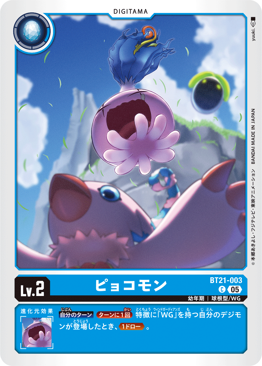 Lv.2 ピョコモン BT21-003 C 幼年期 | 球根型/WG --- 【自分のターン】[ターンに1回]特徴に「WG」を持つ自分のデジモンが登場したとき、≪1ドロー≫。