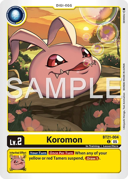 Lv.2 Koromon BT21-004 C In-Training | Lesser/Hero - --- [Your Turn] [Once Per Turn] When any of your yellow or red Tamers suspend, <Draw 1>.