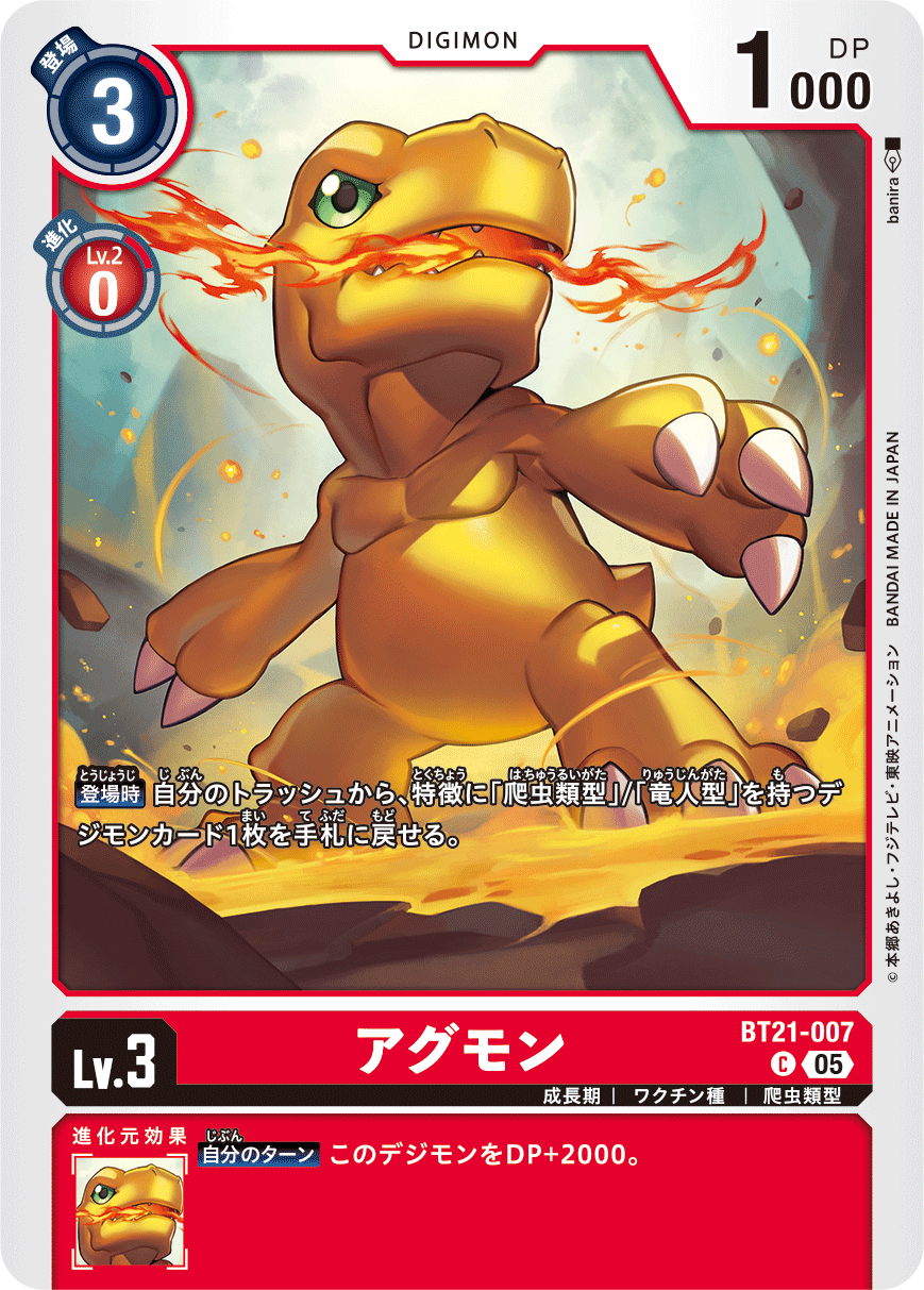 Lv.3 アグモン BT21-007 C 成長期 | ワクチン種 | 爬虫類型 【登場時】自分のトラッシュから、特徴に「爬虫類型」/「竜人型」を持つデジモンカード1枚を手札に戻せる。 --- 【自分のターン】このデジモンをDP+2000。