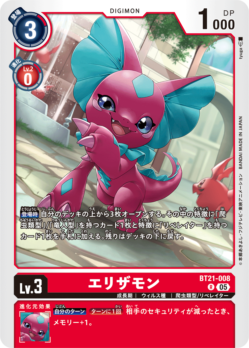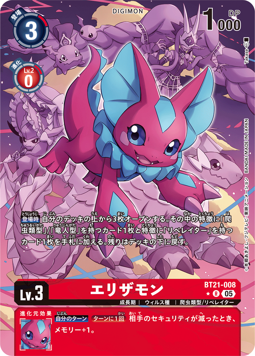 Lv.3 エリザモン BT21-008 R 成長期 | ウィルス種 | 爬虫類型/リベレイター 【登場時】自分のデッキの上から3枚オープンする。その中の特徴に「爬虫類型」/「竜人型」を持つカード1枚と特徴に「リベレイター」を持つカード1枚を手札に加える。残りはデッキの下に戻す。 --- 【自分のターン】[ターンに1回]相手のセキュリティが減ったとき、メモリー+1。