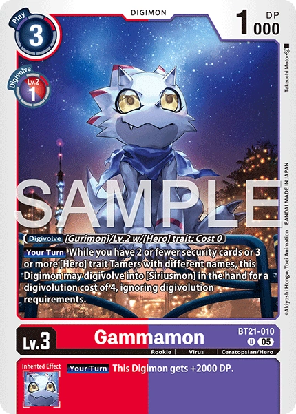 Lv.3 Gammamon BT21-010 U Rookie | Virus | Ceratopsian/Hero [Your Turn] While you have 2 or fewer security cards or 3 or more [Hero] trait Tamers with different names, this Digimon may digivolve into [Siriusmon] in the hand for a digivolution cost of 4, ignoring digivolution requirements. --- [Your Turn] This Digimon gets +2000 DP.