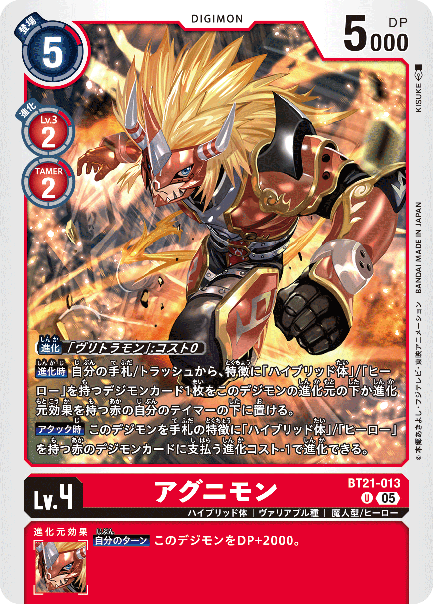 Lv.4 アグニモン BT21-013 U ハイブリッド体 | ヴァリアブル種 | 魔人型/ヒーロー 【進化時】自分の手札/トラッシュから、特徴に「ハイブリッド体」/「ヒーロー」を持つデジモンカード1枚をこのデジモンの進化元の下か進化元効果を持つ赤の自分のテイマーの下に置ける。 【アタック時】このデジモンを手札の特徴に「ハイブリッド体」/「ヒーロー」を持つ赤のデジモンカードに支払う進化コスト-1で進化できる。 --- 【自分のターン】このデジモンをDP+2000。