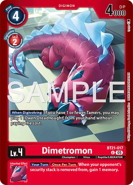 Lv.4 Dimetromon BT21-017 U champion | Virus | Reptile/LIBERATOR [When Digivolving] If you have 1 or fewer Tamers, you may play 1 [Owen Dreadnought] from your hand without paying the cost. --- [Your Turn] [Once Per Turn] When your opponent's security stack is removed from, gain 1 memory.