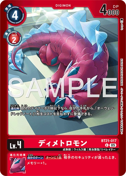 Lv.4 ディメトロモン BT21-017 U 成熟期 | ウィルス種 | 爬虫類型/リベレイター 【進化時】自分のテイマーが1体以下なら、自分の手札から、「オーウェン• ドレッドノート」1枚をコストを支払わずに登場できる。 --- 【自分のターン】[ターンに1回]相手のセキュリティが減ったとき、メモリー+1。