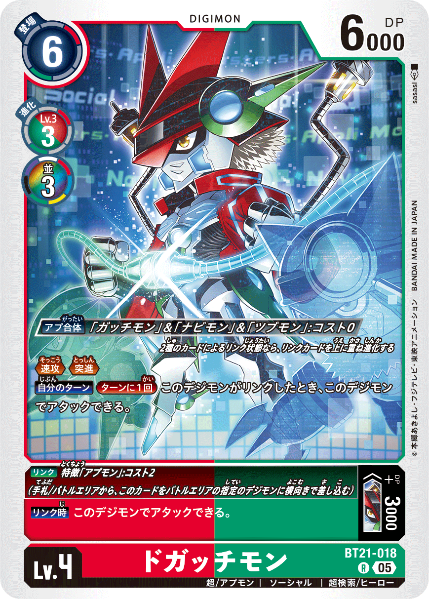 Lv.4 ドガッチモン BT21-018 R 超/アプモン | ソーシャル | 超検索/ヒーロー ≪速攻≫≪突進≫ 【自分のターン】[ターンに1回]このデジモンがリンクしたとき、このデジモンでアタックできる。 --- 〈リンク〉特徴「アプモン」:コスト2(手札/バトルエリアから、このカードをバトルエリアの指定のデジモンに横向きで差し込む) リンク: +DP+3000DP リンク: 【リンク時】このデジモンでアタックできる。