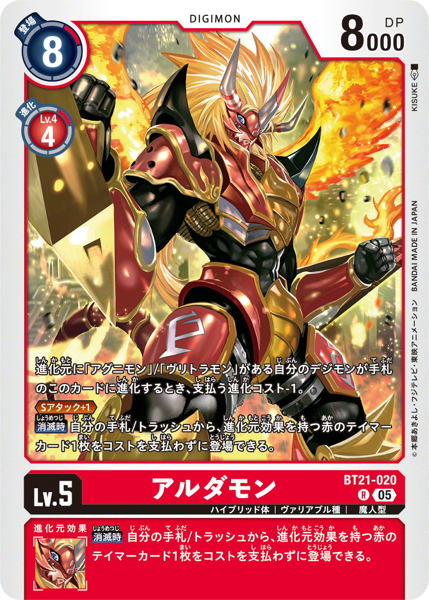 Lv.5 アルダモン BT21-020 R ハイブリッド体 | ヴァリアブル種 | 魔人型 進化元に「アグニモン」/「ヴリトラモン」がある自分のデジモンが手札のこのカードに進化するとき、支払う進化コスト-1。 ≪Sアタック+1≫ 【消滅時】自分の手札/トラッシュから、進化元効果を持つ赤のテイマーカード1枚をコストを支払わずに登場できる。 --- 【消滅時】自分の手札/トラッシュから、進化元効果を持つ赤のテイマーカード1枚をコストを支払わずに登場できる。