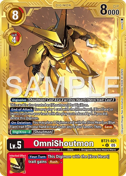 Lv.5 OmniShoutmon BT21-021 U ultimate | Data | Dragonkin/Xros Heart/Hero [Digivolve] [Shoutmon]: Cost 4 [Digivolve] Lv.4 w/[Xros Heart]/[Hero] trait: Cost 3 This card is also treated as [Shoutmon] for DigiXros. [End of Attack] You may play 1 card with the [Xros Heart], [Blue Flare] or [Hero] trait from your hand with the play cost reduced by 5. If you did, delete this Digimon. [On Deletion] You may place 1 Digimon card with the [Xros Heart] or [Blue Flare] trait from your hand or trash under any of your Tamers. Then, <Save>. DigiXros -2: [Shoutmon] --- [Your Turn] This Digimon with the [Xros Heart] trait gains <Rush>.