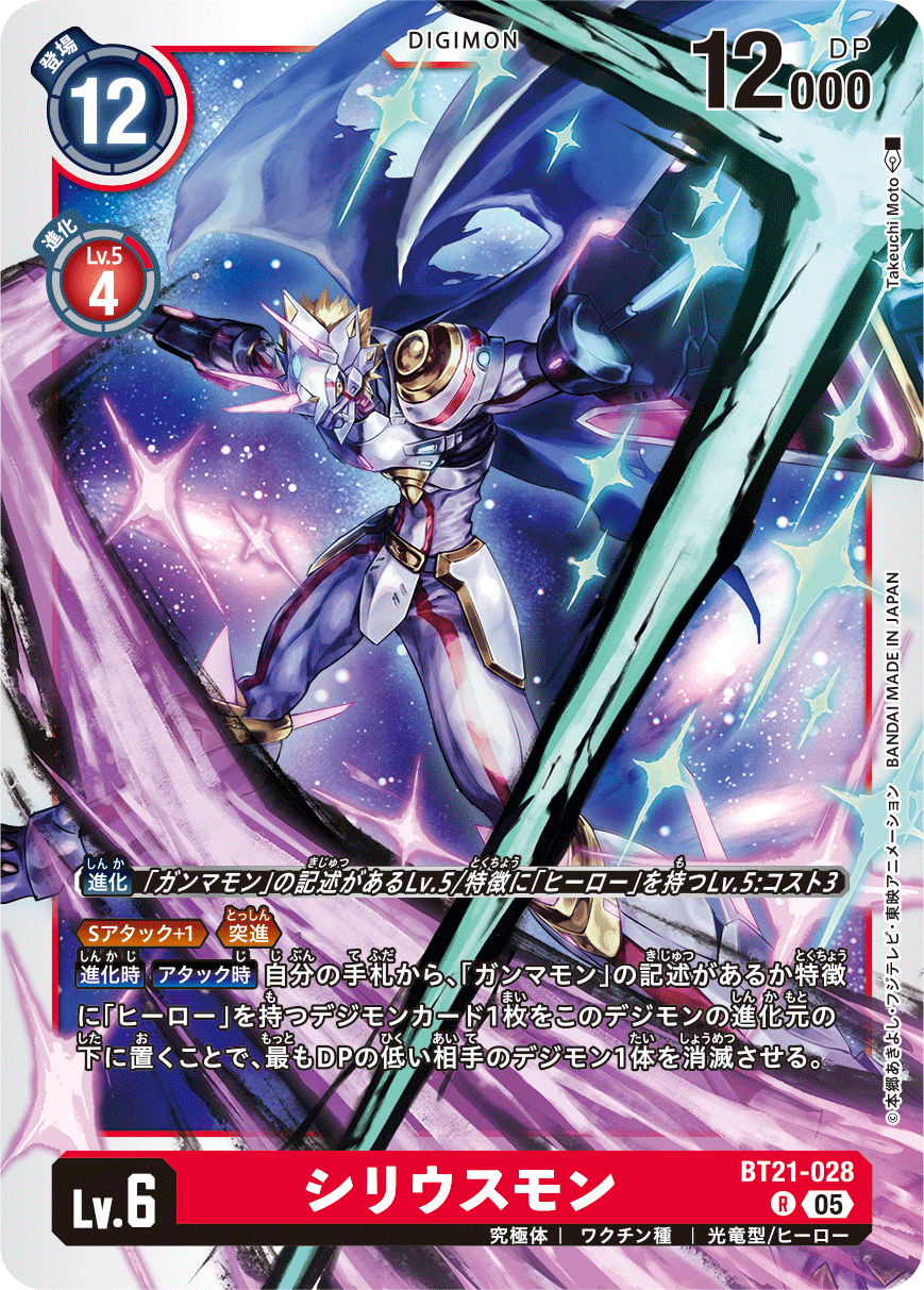 Lv.6 シリウスモン BT21-028 R 究極体 | ワクチン種 | 光竜型/ヒーロー ≪Sアタック+1≫≪突進≫ 【進化時】【アタック時】自分の手札から、「ガンマモン」の記述があるか特徴に「ヒーロー」を持つデジモンカード1枚をこのデジモンの進化元の下に置くことで、最もDPの低い相手のデジモン1体を消滅させる。 ---