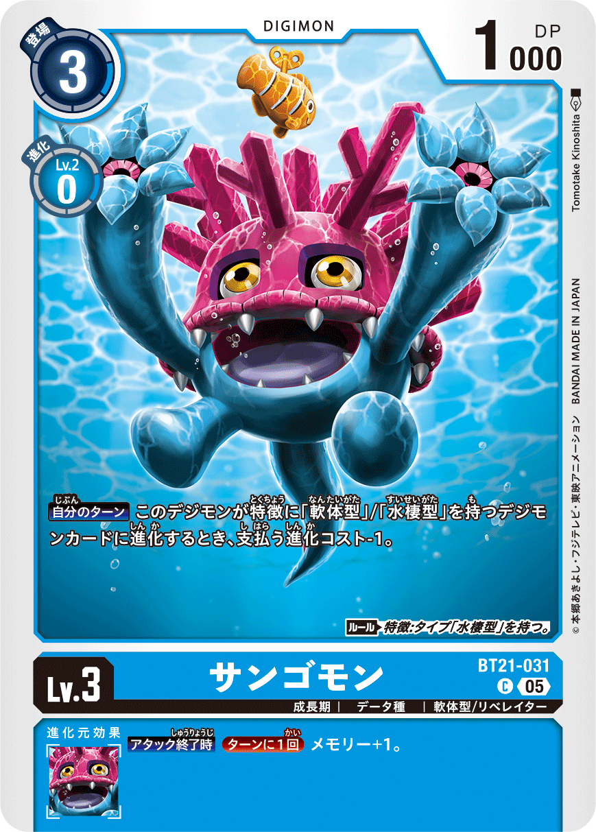 Lv.3 サンゴモン BT21-031 C 成長期 | データ種 | 軟体型/リベレイター 【自分のターン】このデジモンが特徴に「軟体型」/「水棲型」を持つデジモンカードに進化するとき、支払う進化コスト-1。 〈ルール〉特徴:タイプ「水棲型」を持つ。 --- 【アタック終了時】[ターンに1回]メモリー+1。