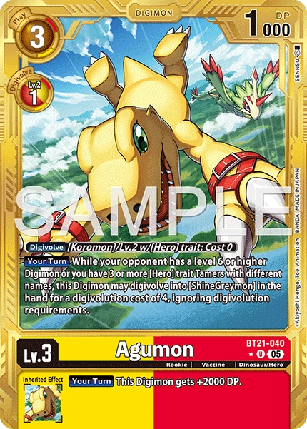 Lv.3 Agumon BT21-040 U rookie | Vaccine | Dinosaur/Hero [Digivolve] [Koromon] or Lv.2 w/[Hero] trait: Cost 0 [Your Turn] While your opponent has a level 6 or higher Digimon or you have 3 or more [Hero] trait Tamers with different names, this Digimon may digivolve into [ShineGreymon] in the hand for a digivolution cost of 4, ignoring digivolution requirements. --- [Your Turn] This Digimon gets +2000 DP.