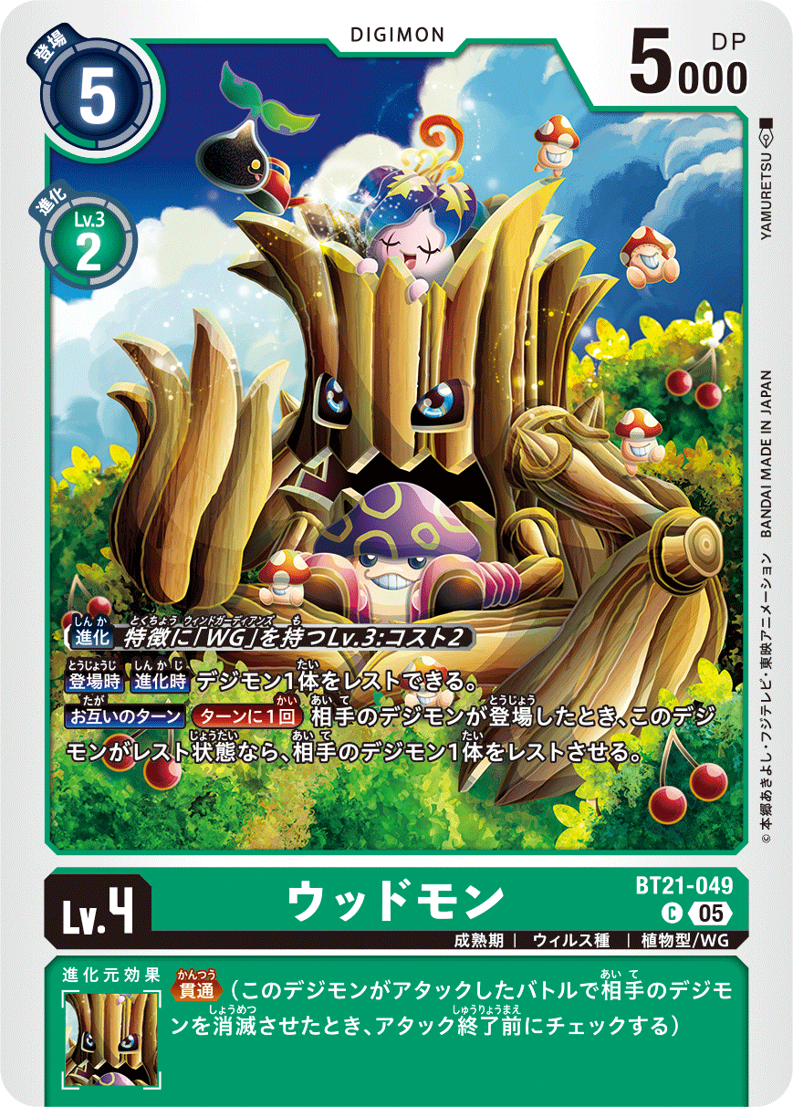 Lv.4 ウッドモン BT21-049 C 成熟期 | ウィルス種 | 植物型/WG 【登場時】【進化時】デジモン1体をレストできる。 【お互いのターン】[ターンに1回]相手のデジモンが登場したとき、このデジモンがレスト状態なら、相手のデジモン1体をレストさせる。 --- ≪貫通≫(このデジモンがアタックしたバトルで相手のデジモンを消滅させたとき、アタック終了前にチェックする)