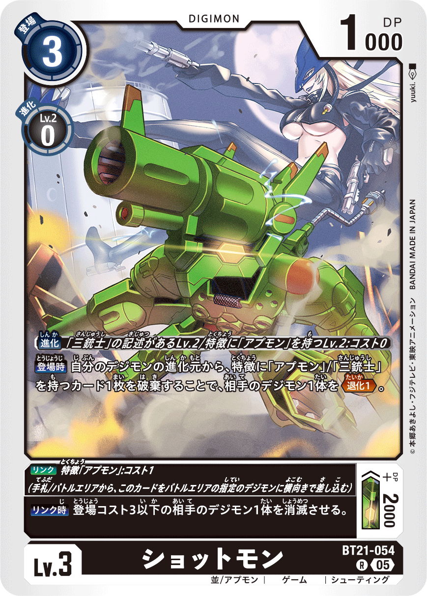 Lv.3 ショットモン BT21-054 R 並/アプモン | ゲーム | シューティング 【登場時】自分のデジモンの進化元から、特徴に「アプモン」/「三銃士」を持つカード1枚を破棄することで、相手のデジモン1体を≪退化1≫。 --- 〈リンク〉特徴「アプモン」:コスト1(手札/バトルエリアから、このカードをバトルエリアの指定のデジモンに横向きで差し込む) リンク: +DP+2000DP リンク: 【リンク時】登場コスト3以下の相手のデジモン1体を消滅させる。
