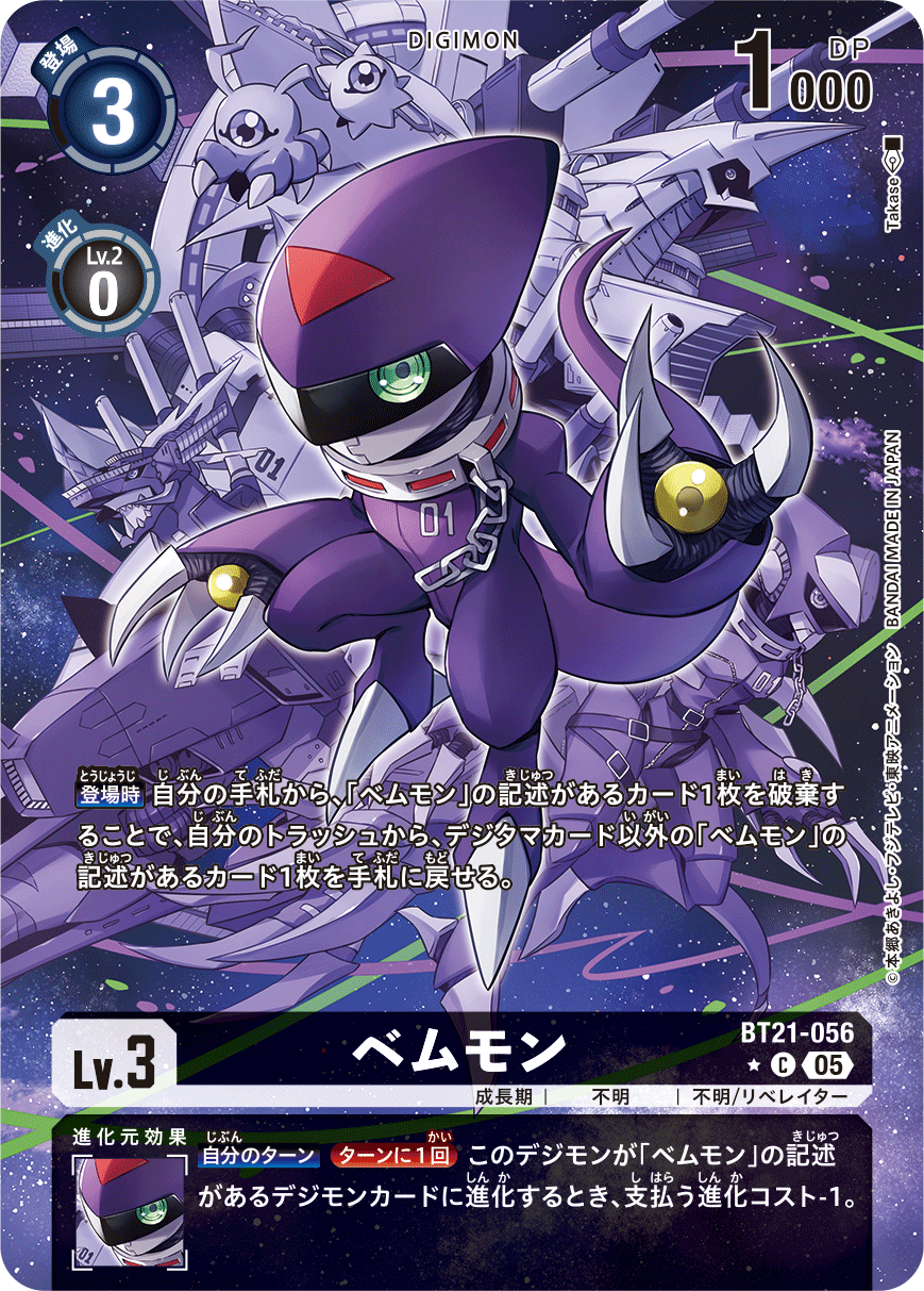 Lv.3 ベムモン BT21-056 C 成長期 | 不明 | 不明/リベレイター 【登場時】自分の手札から、「ベムモン」の記述があるカード1枚を破棄することで、自分のトラッシュから、デジタマカード以外の「ベムモン」の記述があるカード1枚を手札に戻せる。 --- 【自分のターン】[ターンに1回]このデジモンが「ベムモン」の記述があるデジモンカードに進化するとき、支払う進化コスト-1。
