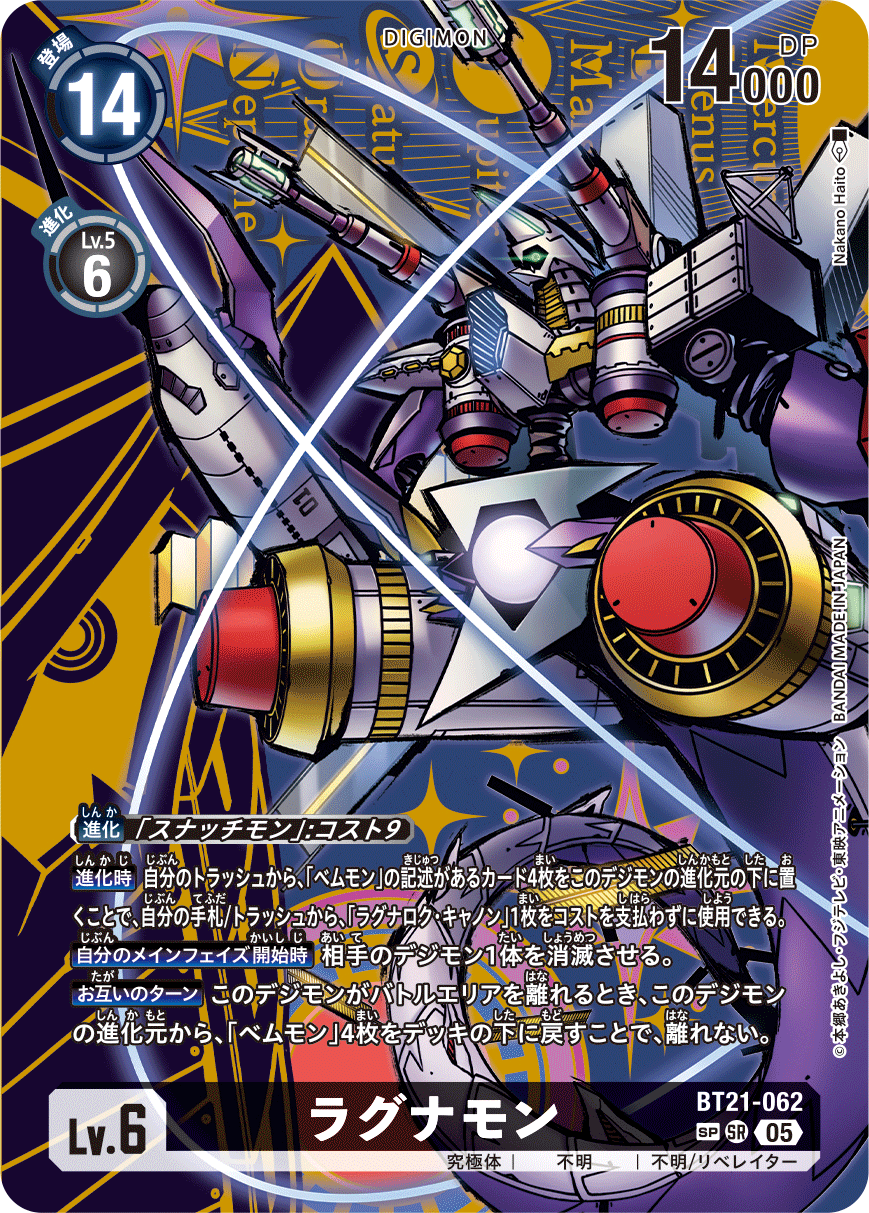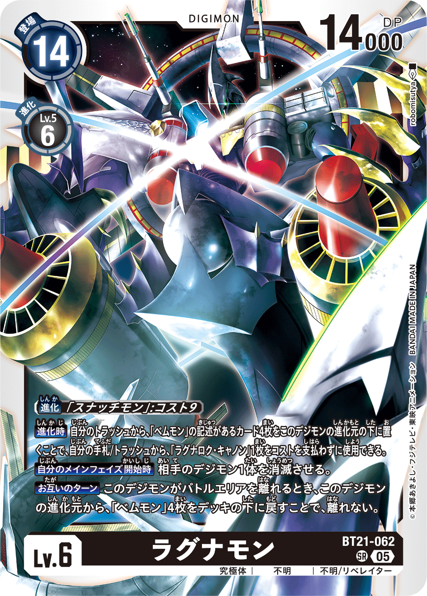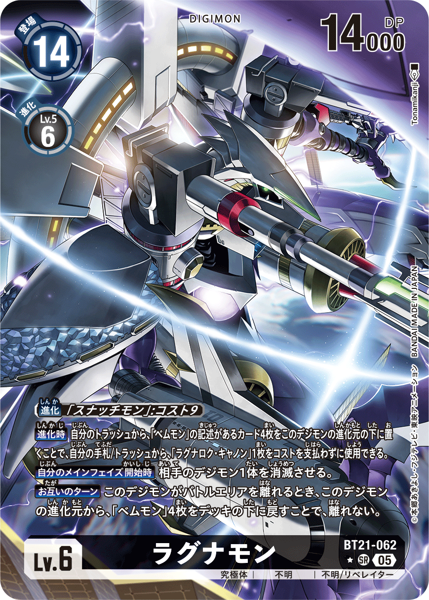 Lv.6 ラグナモン BT21-062 SR 究極体 | 不明 | 不明/リベレイター 【進化時】自分のトラッシュから、「ベムモン」の記述があるカード4枚をこのデジモンの進化元の下に置くことで、自分の手札/トラッシュから、「ラグナロク• キャノン」1枚をコストを支払わずに使用できる。 【自分のメインフェイズ開始時】相手のデジモン1体を消滅させる。 【お互いのターン】このデジモンがバトルエリアを離れるとき、このデジモンの進化元から、「ベムモン」4枚をデッキの下に戻すことで、離れない。 ---