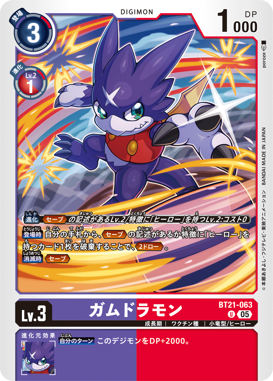 Lv.3 ガムドラモン BT21-063 U 成長期 | ワクチン種 | 小竜型/ヒーロー 【登場時】自分の手札から、≪セーブ≫の記述があるか特徴に「ヒーロー」を持つカード1枚を破棄することで、≪2ドロー≫。 【消滅時】≪セーブ≫ --- 【自分のターン】このデジモンをDP+2000。