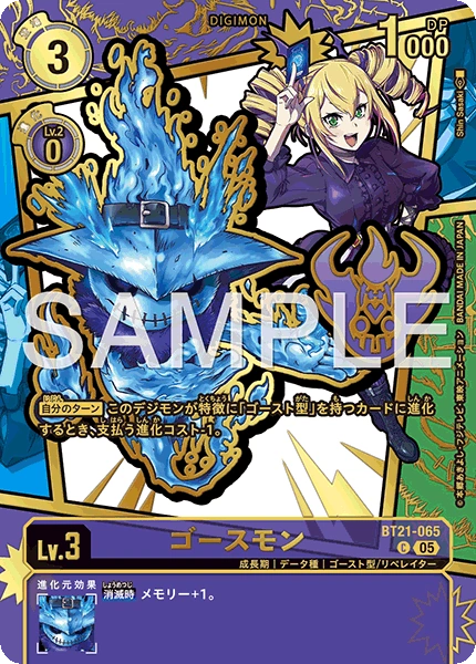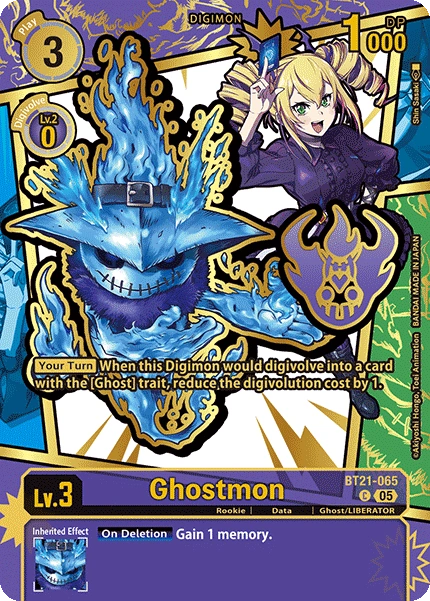 Lv.3 Ghostmon BT21-065 C rookie | Data | Ghost/LIBERATOR [Your Turn] When this Digimon would digivolve into a card with the [Ghost] trait, reduce the digivolution cost by 1. --- [On Deletion] Gain 1 memory.