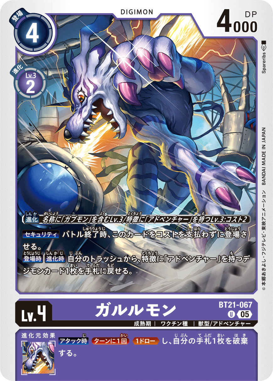 Lv.4 ガルルモン BT21-067 U 成熟期 | ワクチン種 | 獣型/アドベンチャー 【セキュリティ】バトル終了時、このカードをコストを支払わずに登場させる。 【登場時】【進化時】自分のトラッシュから、特徴に「アドベンチャー」を持つデジモンカード1枚を手札に戻せる。 --- 【アタック時】[ターンに1回]≪1ドロー≫し、自分の手札1枚を破棄する。