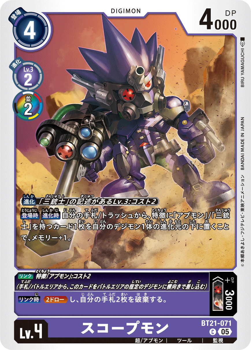 Lv.4 スコープモン BT21-071 C 超/アプモン | ツール | 監視 【登場時】【進化時】自分の手札/トラッシュから、特徴に「アプモン」/「三銃士」を持つカード1枚を自分のデジモン1体の進化元の下に置くことで、メモリー+1。 --- 〈リンク〉特徴「アプモン」:コスト2(手札/バトルエリアから、このカードをバトルエリアの指定のデジモンに横向きで差し込む) リンク: +DP+3000DP リンク: 【リンク時】≪2ドロー≫し、自分の手札2枚を破棄する。