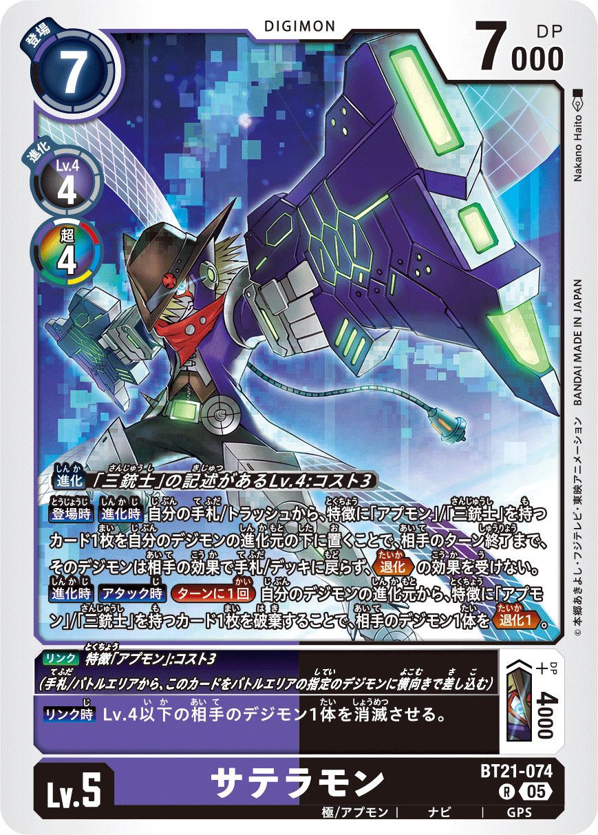 Lv.5 サテラモン BT21-074 R 極/アプモン | ナビ | GPS 【登場時】【進化時】自分の手札/トラッシュから、特徴に「アプモン」/「三銃士」を持つカード1枚を自分のデジモンの進化元の下に置くことで、相手のターン終了まで、そのデジモンは相手の効果で手札/デッキに戻らず、≪退化≫の効果を受けない。 【進化時】【アタック時】[ターンに1回]自分のデジモンの進化元から、特徴に「アプモン」/「三銃士」を持つカード1枚を破棄することで、相手のデジモン1体を≪退化1≫。 --- 〈リンク〉特徴「アプモン」:コスト3(手札/バトルエリアから、このカードをバトルエリアの指定のデジモンに横向きで差し込む) リンク: +DP+4000DP リンク: 【リンク時】Lv.4以下の相手のデジモン1体を消滅させる。