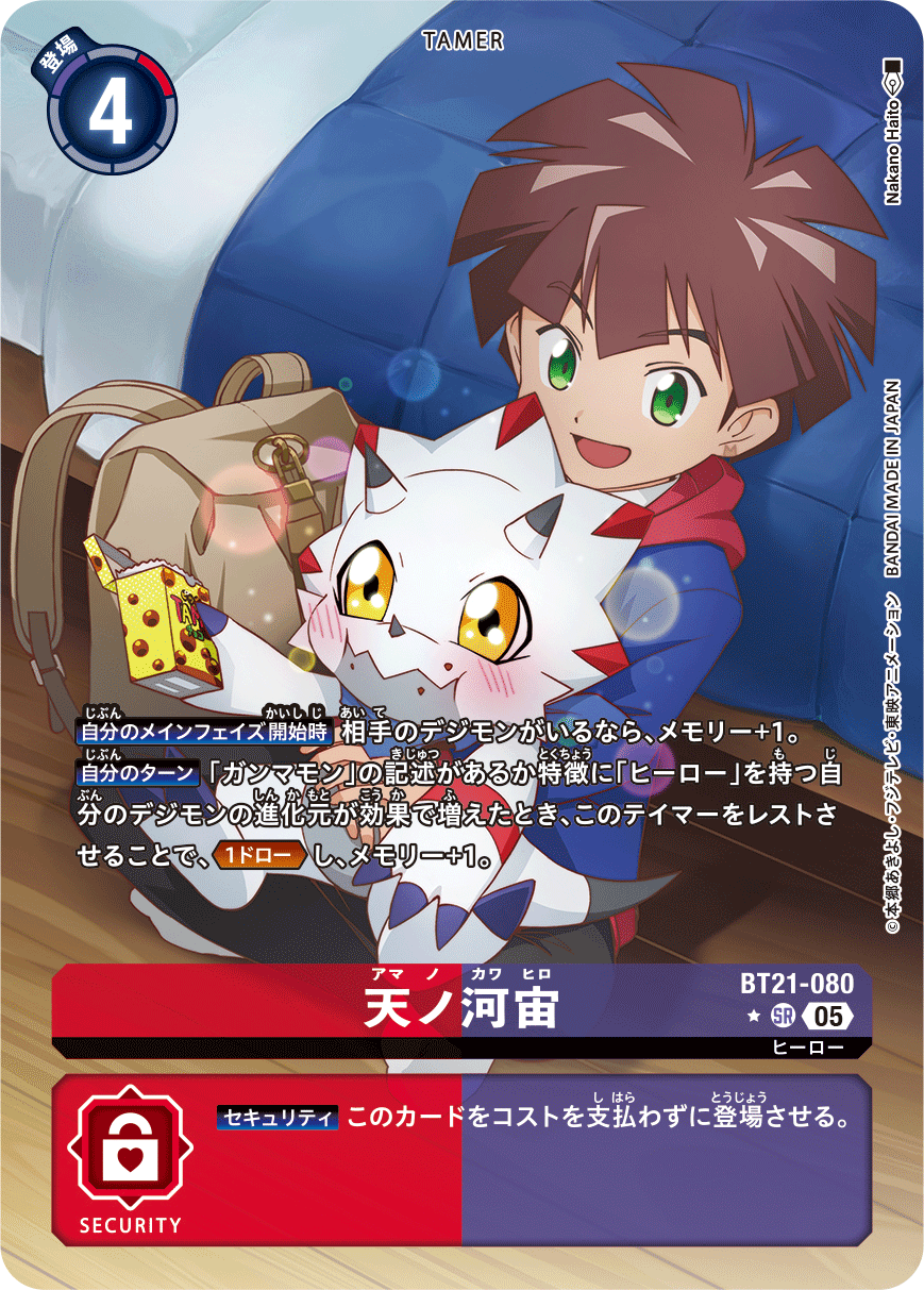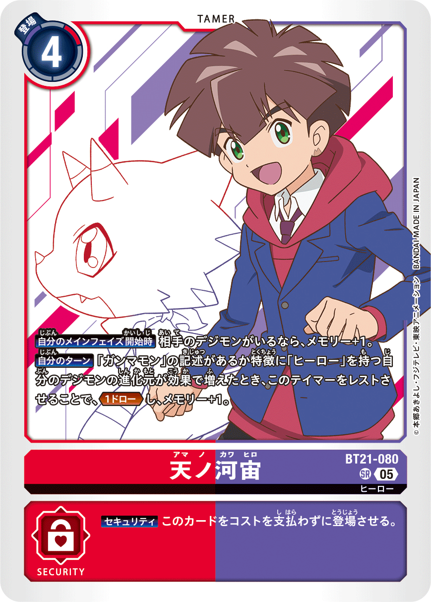 天ノ河宙 BT21-080 SR ヒーロー 【自分のメインフェイズ開始時】相手のデジモンがいるなら、メモリー+1。 【自分のターン】「ガンマモン」の記述があるか特徴に「ヒーロー」を持つ自分のデジモンの進化元が効果で増えたとき、このテイマーをレストさせることで、≪1ドロー≫し、メモリー+1。 --- 【セキュリティ】このカードをコストを支払わずに登場させる。