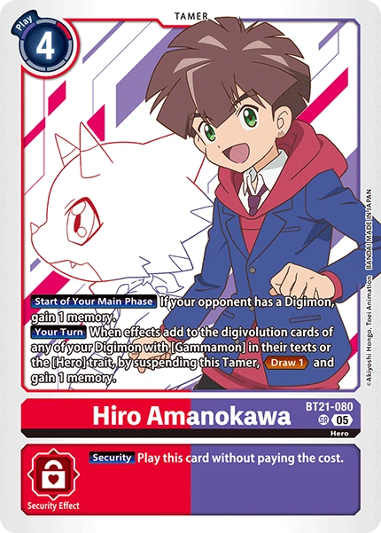Hiro Amanokawa BT21-080 SR Hero [Start of Your Main Phase] If your opponent has a Digimon, gain 1 memory. [Your Turn] When effects place digivolution cards under any of your Digimon with [Gammamon] in their texts or the [Hero] trait, by suspending this Tamer, <Draw 1> and gain 1 memory. --- [Security] Play this card without paying the cost.