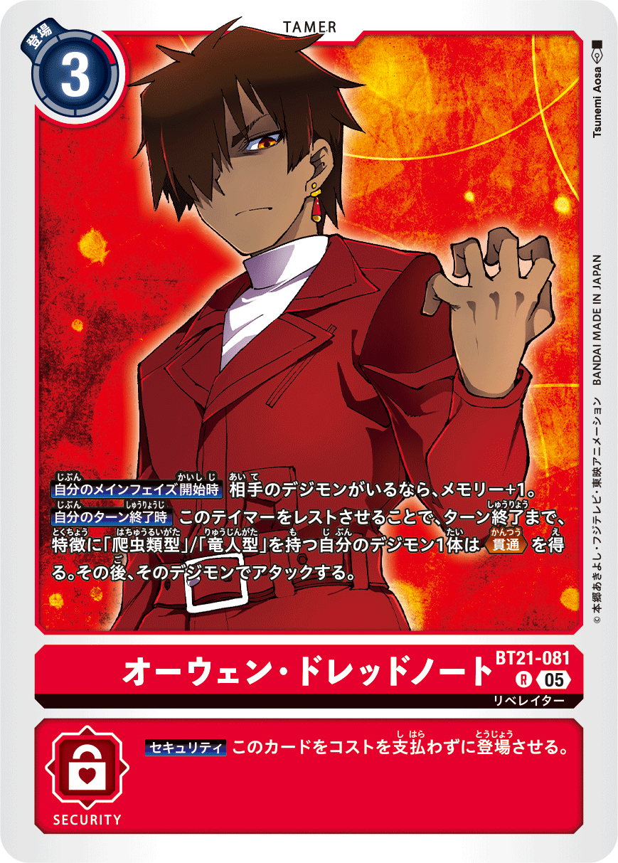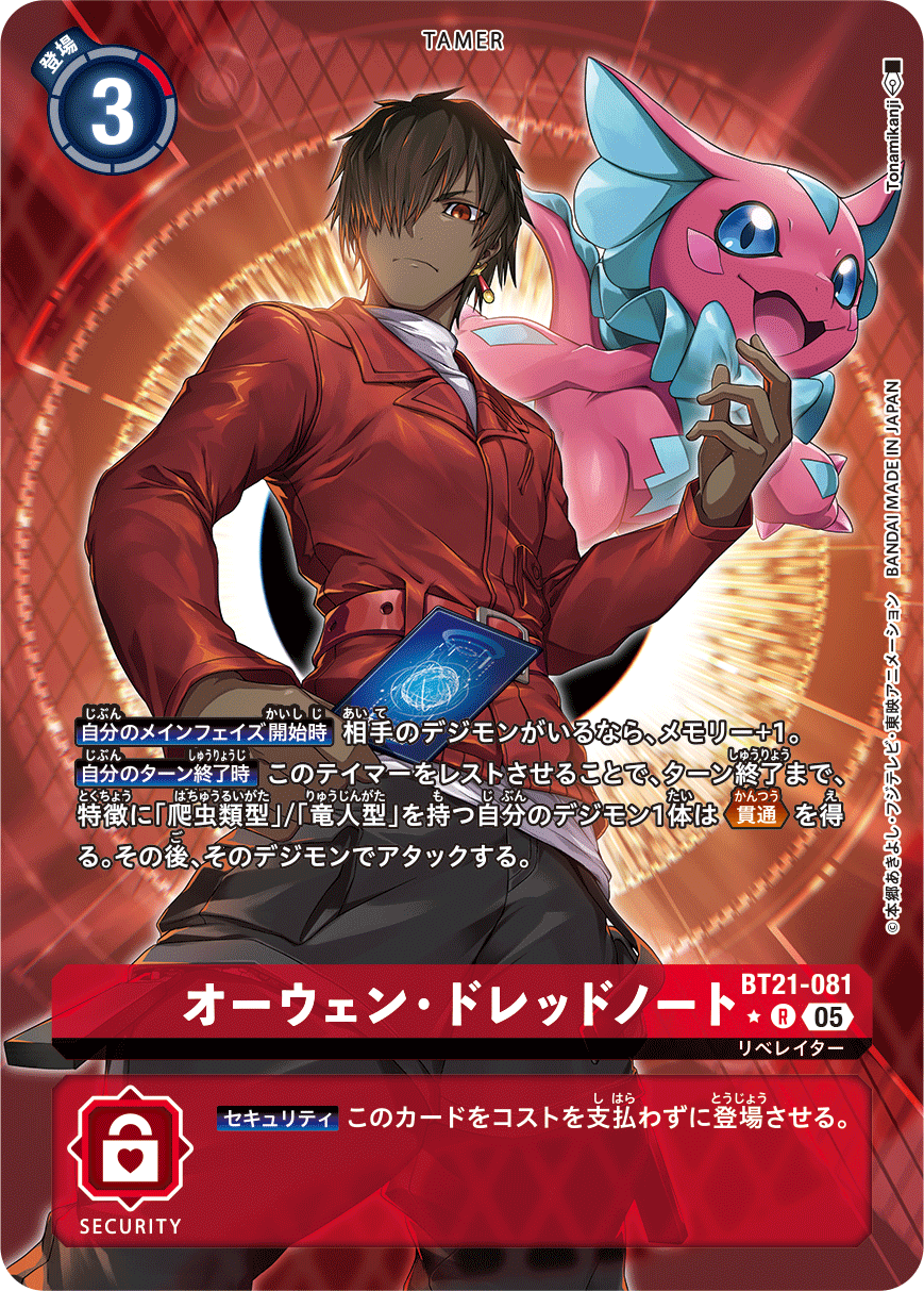 オーウェン• ドレッドノート BT21-081 R リベレイター 【自分のメインフェイズ開始時】相手のデジモンがいるなら、メモリー+1。 【自分のターン終了時】このテイマーをレストさせることで、ターン終了まで、特徴に「爬虫類型」/「竜人型」を持つ自分のデジモン1体は≪貫通≫を得る。その後、そのデジモンでアタックする。 --- 【セキュリティ】このカードをコストを支払わずに登場させる。