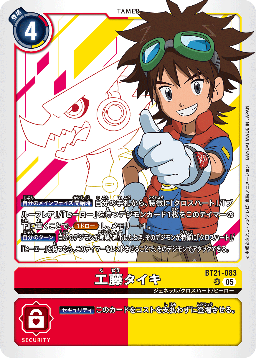 Taiki Kudo BT21-083 SR General/Xros Heart/Hero [Start of Your Main Phase] By placing 1 Digimon card with the [Xros Heart], [Blue Flare] or [Hero] trait from your hand under this Tamer, <Draw 1> and gain 1 memory. [Your Turn] When your Digimon are played or digivolve, if any of them have the [Xros Heart] or [Hero] trait, by suspending this Tamer, one of them may attack. --- [Security] Play this card without paying the cost.