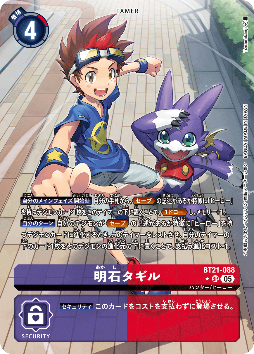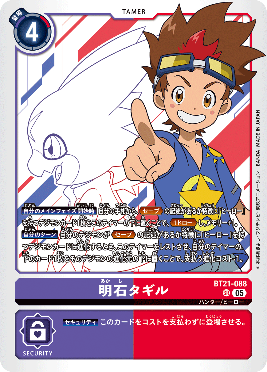 明石タギル BT21-088 SR ハンター/ヒーロー 【自分のメインフェイズ開始時】自分の手札から、≪セーブ≫の記述があるか特徴に「ヒーロー」を持つデジモンカード1枚をこのテイマーの下に置くことで、≪1ドロー≫し、メモリー+1。 【自分のターン】自分のデジモンが≪セーブ≫の記述があるか特徴に「ヒーロー」を持つデジモンカードに進化するとき、このテイマーをレストさせ、自分のテイマーの下のカード1枚をそのデジモンの進化元の下に置くことで、支払う進化コスト-1。 --- 【セキュリティ】このカードをコストを支払わずに登場させる。