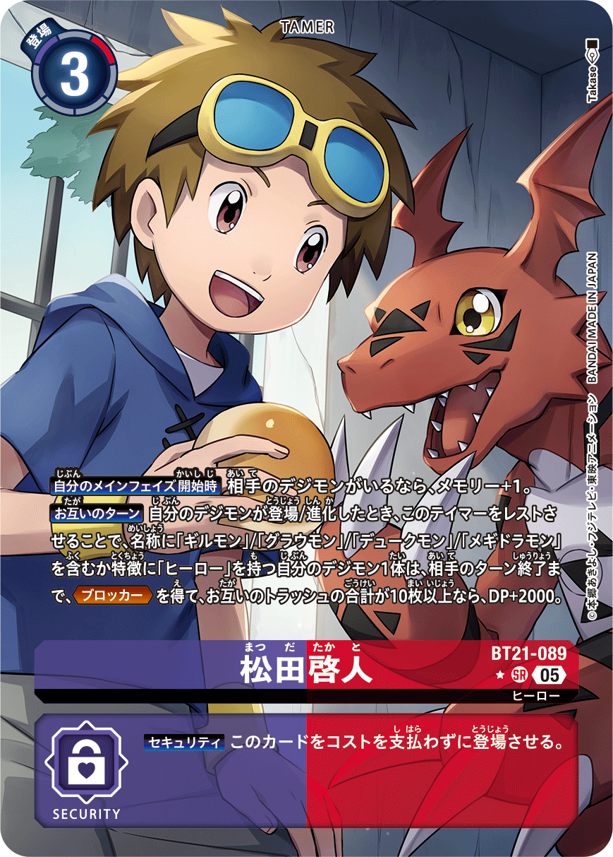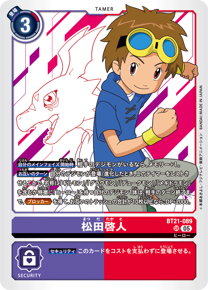 松田啓人 BT21-089 SR ヒーロー 【自分のメインフェイズ開始時】相手のデジモンがいるなら、メモリー+1。 【お互いのターン】自分のデジモンが登場/進化したとき、このテイマーをレストさせることで、名称に「ギルモン」/「グラウモン」/「デュークモン」/「メギドラモン」を含むか特徴に「ヒーロー」を持つ自分のデジモン1体は、相手のターン終了まで、≪ブロッカー≫を得て、お互いのトラッシュの合計が10枚以上なら、DP+2000。 --- 【セキュリティ】このカードをコストを支払わずに登場させる。