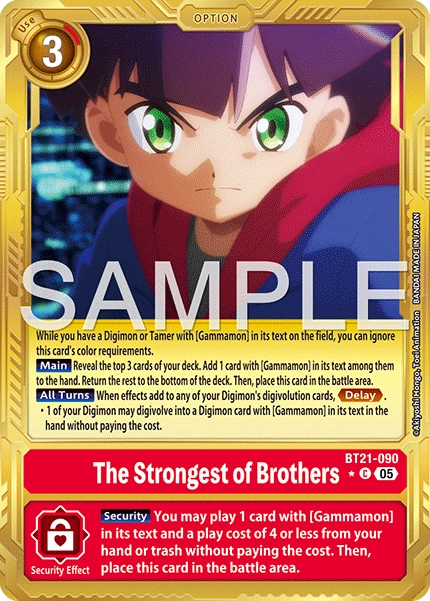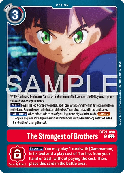 The Strongest of Brothers BT21-090 C While you have a Digimon or Tamer with [Gammamon] in its text on the field, you can ignore this card's color requirements. [Main] Reveal the top 3 cards of your deck. Add 1 card with [Gammamon] in its text among them to the hand. Return the rest to the bottom of the deck. Then, place this card in the battle area. [All Turns] When effects place digivolution cards under your Digimon, <Delay> • 1 of your Digimon may digivolve into a Digimon card with [Gammamon] in its text in the hand without paying the cost. --- [Security] You may play 1 card with [Gammamon] in its text and a play cost of 4 or less from your hand or trash without paying the cost. Then, place this card in the battle area.