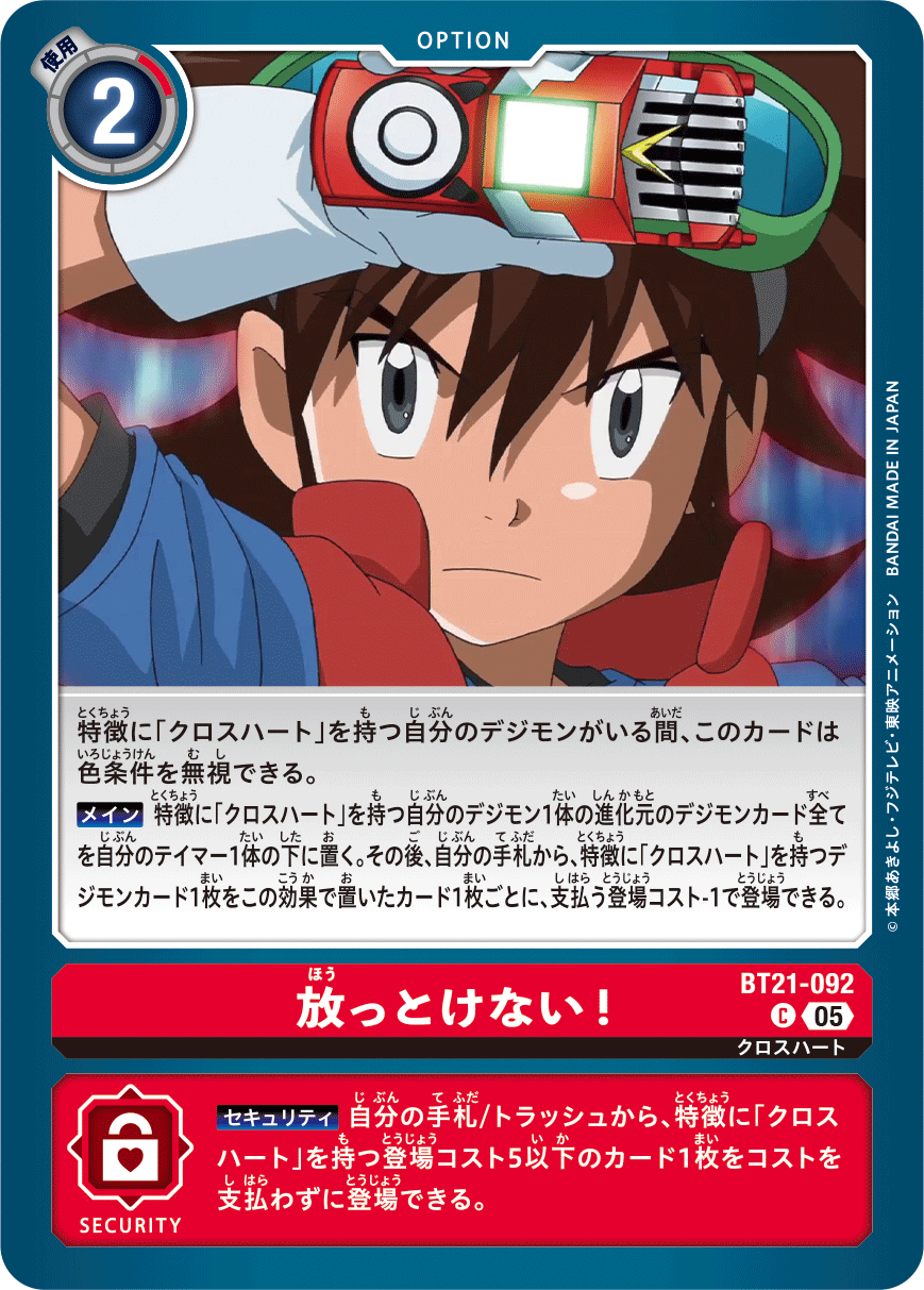 放っとけない! BT21-092 C クロスハート 特徴に「クロスハート」を持つ自分のデジモンがいる間、このカードは色条件を無視できる。 【メイン】特徴に「クロスハート」を持つ自分のデジモン1体の進化元のデジモンカード全てを自分のテイマー1体の下に置く。その後、自分の手札から、特徴に「クロスハート」を持つデジモンカード1枚をこの効果で置いたカード1枚ごとに、支払う登場コスト-1で登場できる。 --- 【セキュリティ】自分の手札/トラッシュから、特徴に「クロスハート」を持つ登場コスト5以下のカード1枚をコストを支払わずに登場できる。
